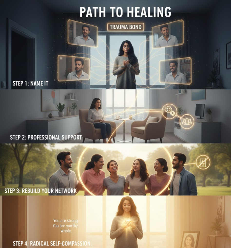The third step is to rebuild your support network. Isolation is one of the most consistent features of trauma-bonded relationships. Reconnecting with friends, family members, or community — people who reflect your real worth back to you, who knew you before the relationship consumed you — is not a luxury. It is part of the treatment.
